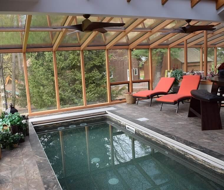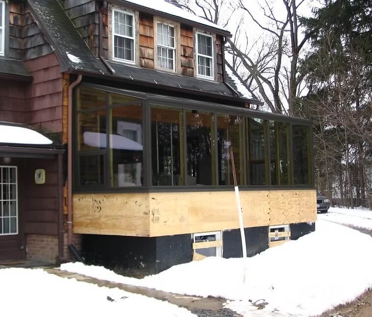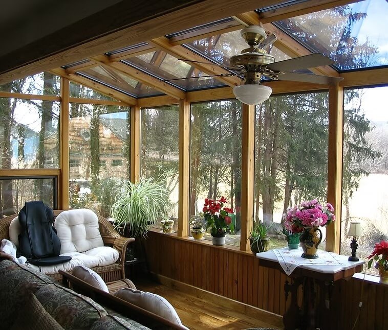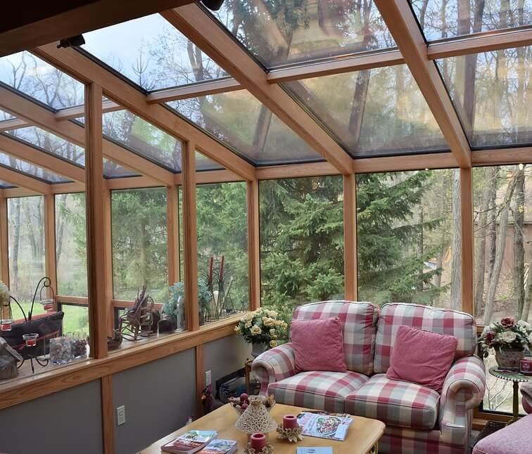 The System wood unit is a beautiful completely wood interior room featuring mortise & tenon beams of either oak or pine. This room features large, full-length picture window glass in the front of the room that opens up your frontal view! Optional awning windows allow for a cross breeze. The exterior of the room is NOT wood. Any part of this room that faces the elements on the exterior are made out of durable aluminum. You can choose between Quaker Bronze, Santone or White for the exterior color.